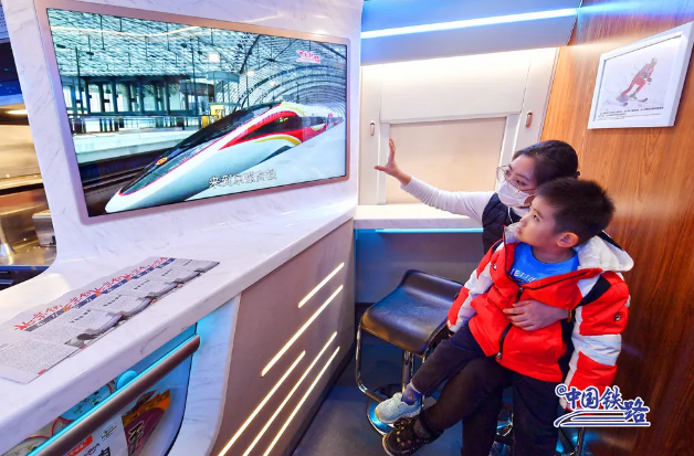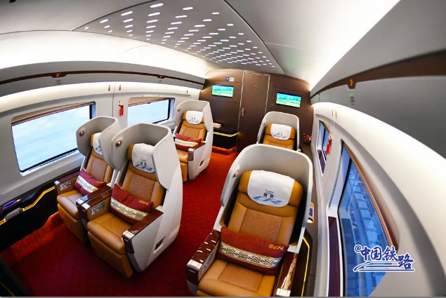 復(fù)興號(hào)智能動(dòng)車組車廂內(nèi)的服務(wù)設(shè)施進(jìn)行了智能化升級(jí),進(jìn)入隧道時(shí),列車可智能控制車內(nèi)壓力,提前調(diào)節(jié)燈光、車窗顏色等。