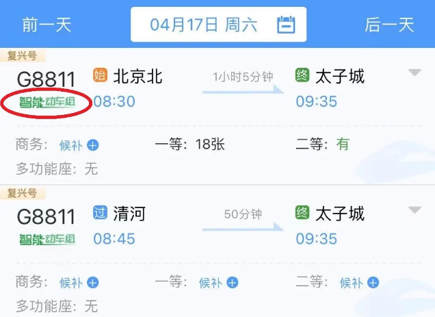 △在12306上購買京張高鐵車票時(shí),該車型車次下方會(huì)有綠色“智能動(dòng)車組”字樣