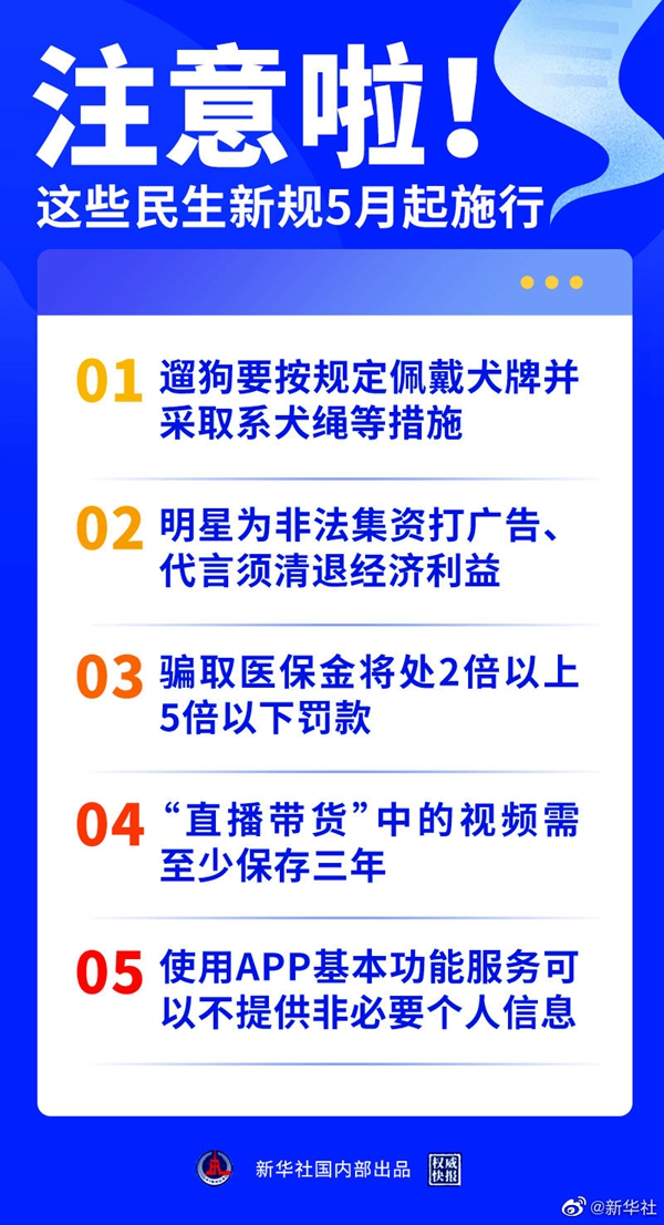 五一假期將如約而至,一批新規(guī)也將于5月1日開始施行。遛狗要系繩、騙醫(yī)保金要罰款、名人為非法集資打廣告要退回酬勞……法治陽光更普照,社會生活更美好。來看看,哪一條切中了你的關心事?(新華社記者白陽 海報設計楊軼群)