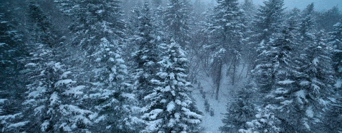 大幕拉開,風(fēng)雪交加,一望無(wú)際的茫茫林海里,是故事的開局之地。航拍第一視角的真實(shí)感鏡頭為我們呈現(xiàn)出開局的困頓感和林海雪原環(huán)境的壯美大氣。