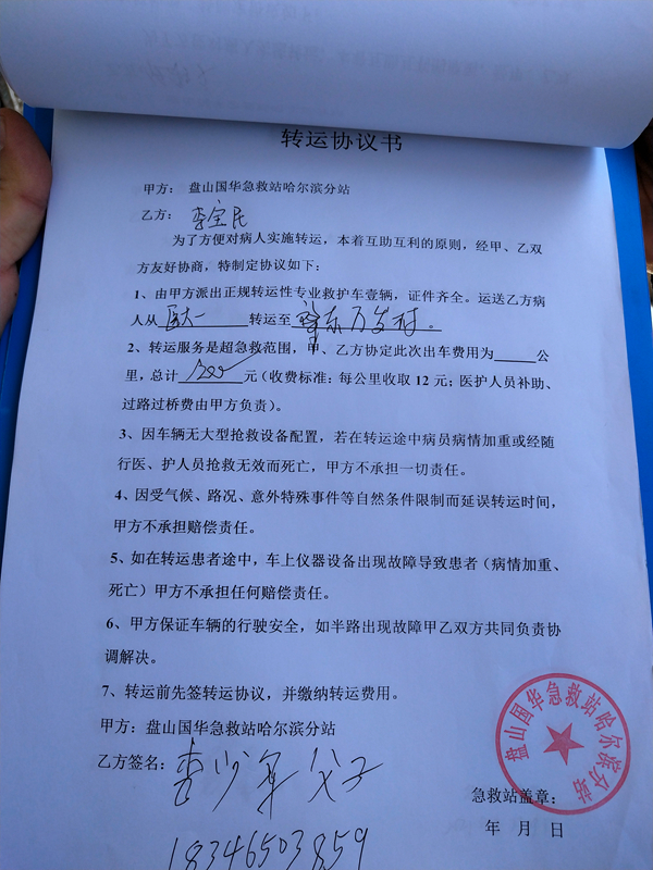 記者詢問了其中一名駕駛員車輛的相關(guān)手續(xù)和單位的資質(zhì),對(duì)方表示不清楚,他們只是司機(jī),負(fù)責(zé)開車,一個(gè)月工資3000元錢,公司指派去哪接人送到哪,他們就按照指示去做。記者又問到:你們是怎么收費(fèi)的?最遠(yuǎn)去到哪?車上有沒有醫(yī)護(hù)人員?對(duì)方說最遠(yuǎn)就是呼蘭,沒出過哈市,收費(fèi)就是按照公里數(shù)收費(fèi)。隨后工作人員在車?yán)镎业搅宿D(zhuǎn)運(yùn)協(xié)議書,其中一張顯示車輛從醫(yī)大一院轉(zhuǎn)運(yùn)至肇東市,收取費(fèi)用是1200元(收費(fèi)標(biāo)準(zhǔn):每公里收取12元,醫(yī)護(hù)人員補(bǔ)助、過路過橋費(fèi)由甲方負(fù)責(zé))。針對(duì)此情況,由于不確定車輛是否具備營運(yùn)資質(zhì),需要和遼寧還有患者家屬方面核實(shí),所以將車輛的相關(guān)證件暫扣。