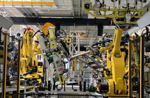資料圖:江西上饒一家新能源電動(dòng)汽車(chē)公司的智慧工廠內(nèi),機(jī)器人正同時(shí)作業(yè)?!±铐嵑?攝