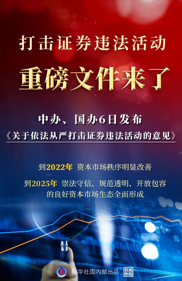 新華社北京7月6日電(記者張千千 劉慧)中共中央辦公廳、國務(wù)院辦公廳6日公開發(fā)布了《關(guān)于依法從嚴打擊證券違法活動的意見》,對建立健全資本市場執(zhí)法司法體制機制、依法從嚴打擊證券違法活動、推動資本市場高質(zhì)量發(fā)展作出重要部署。