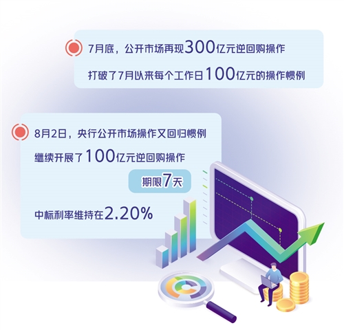 7月底,公開(kāi)市場(chǎng)再現(xiàn)300億元逆回購(gòu)操作,打破了7月以來(lái)每個(gè)工作日100億元的操作慣例。7月29日、30日,中國(guó)人民銀行連續(xù)發(fā)公告稱(chēng),為維護(hù)月末流動(dòng)性平穩(wěn),以利率招標(biāo)方式開(kāi)展了300億元逆回購(gòu)操作,期限7天,中標(biāo)利率維持在2.20%不變。