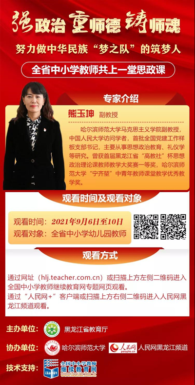 據(jù)了解,自9月6日至10日省教育廳將組織開展“全省中小學(xué)教師共上一堂思政課”活動,將邀請專家學(xué)者就提升思想政治素質(zhì)和師德水平、更好擔(dān)負(fù)起立德樹人根本任務(wù)為全省中小學(xué)教師授課。本次活動將以線上課堂形式舉辦。參加人員通過全國中小學(xué)教師繼續(xù)教育網(wǎng)專題網(wǎng)頁收聽收看。