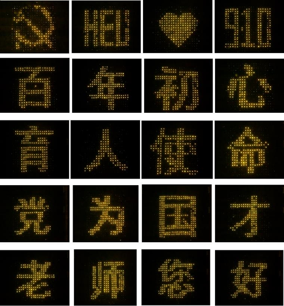 黨徽、HEU(哈工程縮寫)、愛心、9.10、百年初心、育人使命、為黨育人、為國育才、老師您好……同學(xué)們匯聚力量共同拼出了24組圖案和字樣,即使天空飄起毛毛細(xì)雨,他們也絲毫沒有變換位置,在雨中足足站了兩個(gè)小時(shí)。2021級(jí)博士生王文軒感慨:“作為一名本、碩都就讀于哈工程的學(xué)生,這所大學(xué)的老師教會(huì)了我如何做人做事做學(xué)問,我們用這場燈光秀,獻(xiàn)禮我們最尊敬的老師,我們也一定會(huì)傳承哈軍工精神,勇?lián)鷱?qiáng)國百年使命擔(dān)當(dāng)?!?/span>