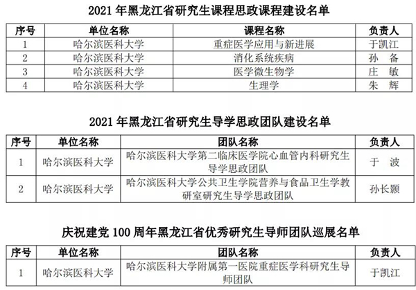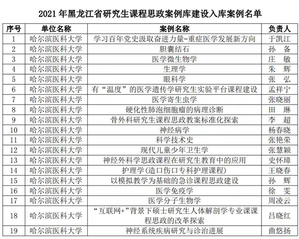 黑龍江經(jīng)濟網(wǎng)訊(黑龍江日報全媒體見習(xí)記者董廣碩 商祺)為貫徹落實國家《關(guān)于全面落實研究生導(dǎo)師立德樹人職責(zé)的意見》《高等學(xué)校課程思政建設(shè)指導(dǎo)綱要》《關(guān)于加快新時代研究生教育改革發(fā)展的意見》精神,按照《關(guān)于加快新時代黑龍江省研究生教育改革發(fā)展的實施意見》要求,日前,經(jīng)全省研究生培養(yǎng)單位遴選推薦,黑龍江省研究生課程思政教育聯(lián)盟專家委員會評審,省學(xué)位委員會、省教育廳批準(zhǔn),哈爾濱醫(yī)科大學(xué)共有26個項目獲批省級立項,其中研究生課程思政課程建設(shè)項目4個、研究生導(dǎo)學(xué)思政團隊(導(dǎo)師)建設(shè)項目2個、研究生課程思政案例19個,慶祝建黨100周年巡展優(yōu)秀研究生導(dǎo)師團隊1支。