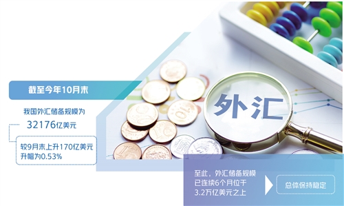 近日,國(guó)家外匯管理局公布的最新外匯儲(chǔ)備規(guī)模數(shù)據(jù)顯示,截至今年10月末,我國(guó)外匯儲(chǔ)備規(guī)模為32176億美元,較9月末上升170億美元,升幅為0.53%。至此,外匯儲(chǔ)備規(guī)模已連續(xù)6個(gè)月位于3.2萬(wàn)億美元之上,總體保持穩(wěn)定。