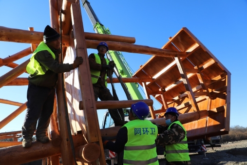 阿木爾林業(yè)局環(huán)衛(wèi)隊(duì)黨員干部職工正在安裝薩布素軍馬場大門(王力 攝)