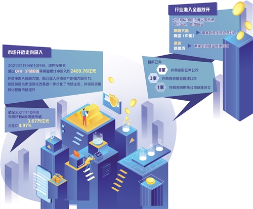 一系列開放舉措吸引了外資的高度關(guān)注和認(rèn)可,外資參與中國市場(chǎng)熱情高漲,在華投資展業(yè)活動(dòng)加快推進(jìn)。截至2021年10月末,外資持有A股流通市值3.67萬億元,占比約4.97%。