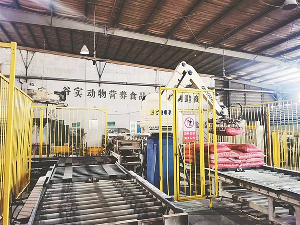 谷實(shí)生物集團(tuán)股份有限公司車(chē)間里的機(jī)器人碼垛設(shè)備。