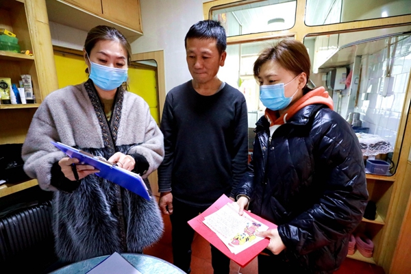 阿木爾社區(qū)志愿者王春草(右)、李建靜(左)走進居民周家讓家中,提醒居民注意防火,并在醒目處張貼《防火公約》(王力 攝)