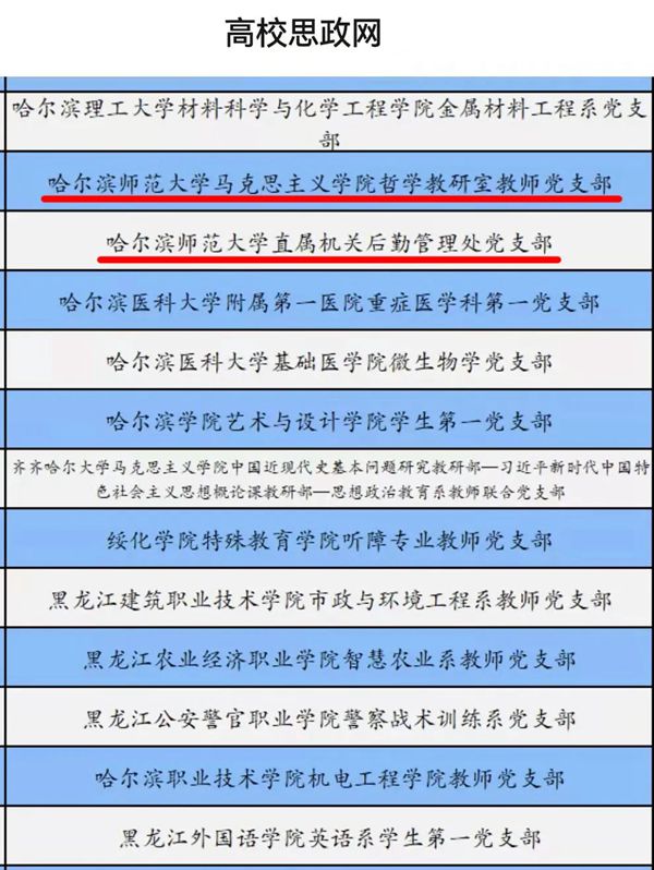 黑龍江經(jīng)濟網(wǎng)訊(黑龍江日報全媒體見習記者董廣碩 商祺)根據(jù)《教育部辦公廳關于開展第三批新時代高校黨建示范創(chuàng)建和質量創(chuàng)優(yōu)工作的通知》要求,經(jīng)哈爾濱師范大學校黨委組織申報、省級黨委教育工作部門推薦、資格審查、專家評審、教育部黨的建設和全面從嚴治黨工作領導小組成員單位集中審議、結果公示,遴選產(chǎn)生了全國黨建工作示范高校、標桿院系和樣板支部。哈爾濱師范大學馬克思主義學院哲學教研室教師黨支部和直屬機關后勤管理處黨支部獲批“全國黨建工作樣板支部”。到目前為止,哈爾濱師范大學共獲批1個全國黨建工作標桿院系,4個全國黨建工作樣板支部,1個全國研究生樣板黨支部,獲批數(shù)量居于省屬高校首位。