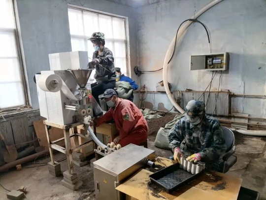 呼中林業(yè)局中心苗圃工人正在進(jìn)行輕基質(zhì)容器育苗杯生產(chǎn)作業(yè)(陳東輝 攝)
