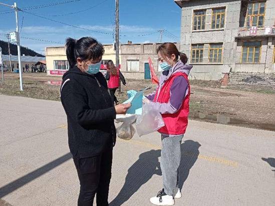 新林林業(yè)局大烏蘇林場“林海流星雨”志愿服務(wù)隊(duì)隊(duì)員在向居民發(fā)放防火宣傳單(劉志剛 攝)