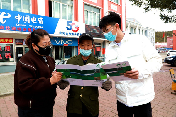 阿木爾林業(yè)局工作人員零距離向職工群眾解答森林認(rèn)證概念、流程、目的等相關(guān)問題(王力 攝)