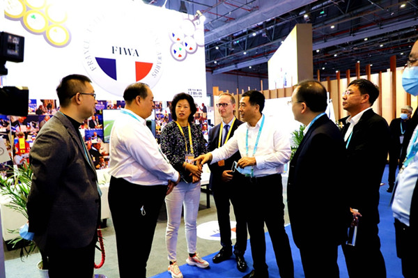 阿木爾林業(yè)局北極冰藍(lán)莓酒莊生產(chǎn)的冰酒、紅酒等產(chǎn)品,在第四屆上海國際進(jìn)出口博覽會上展出。大興安嶺林業(yè)集團(tuán)公司黨委副書記、總經(jīng)理李軍(左五)與國際友人及林業(yè)局參展人員親切交談,了解酒莊產(chǎn)品特點、市場營銷等情況(王力 攝)