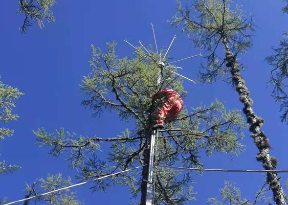 呼中林業(yè)局工作人員依附樹木進行“拒雷”設(shè)備安裝(徐志偉攝)