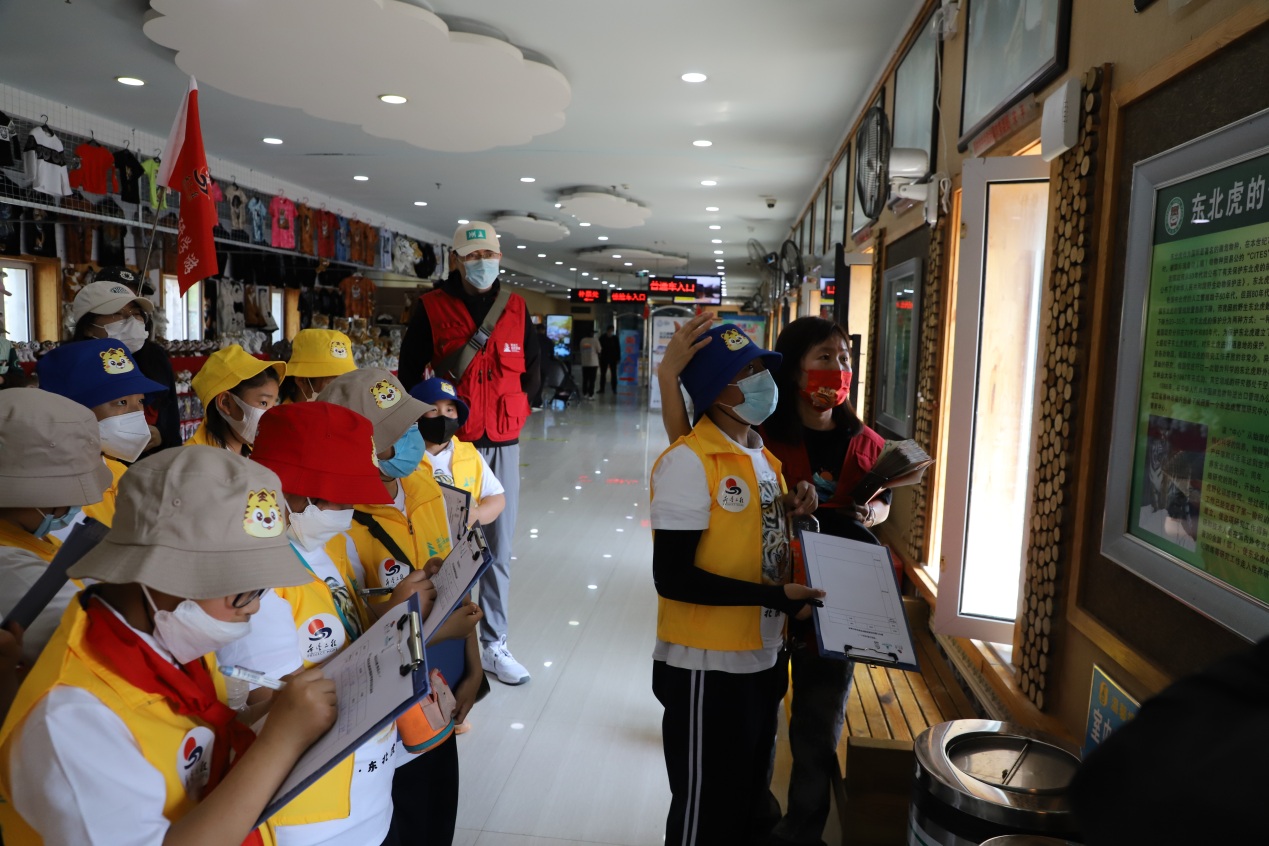 工作人員沿途講解著東北虎遷地保護的重要作用、東北虎科普知識、東北虎文化等,還一邊講解一邊跟小朋友們進行互動,大家踴躍舉起小手,搶著回答問題,爭先恐后展示自己學到的知識,答對的小朋友得到了東北虎林園工作人員獎勵的小禮物,臉上露出了快樂的笑容。
