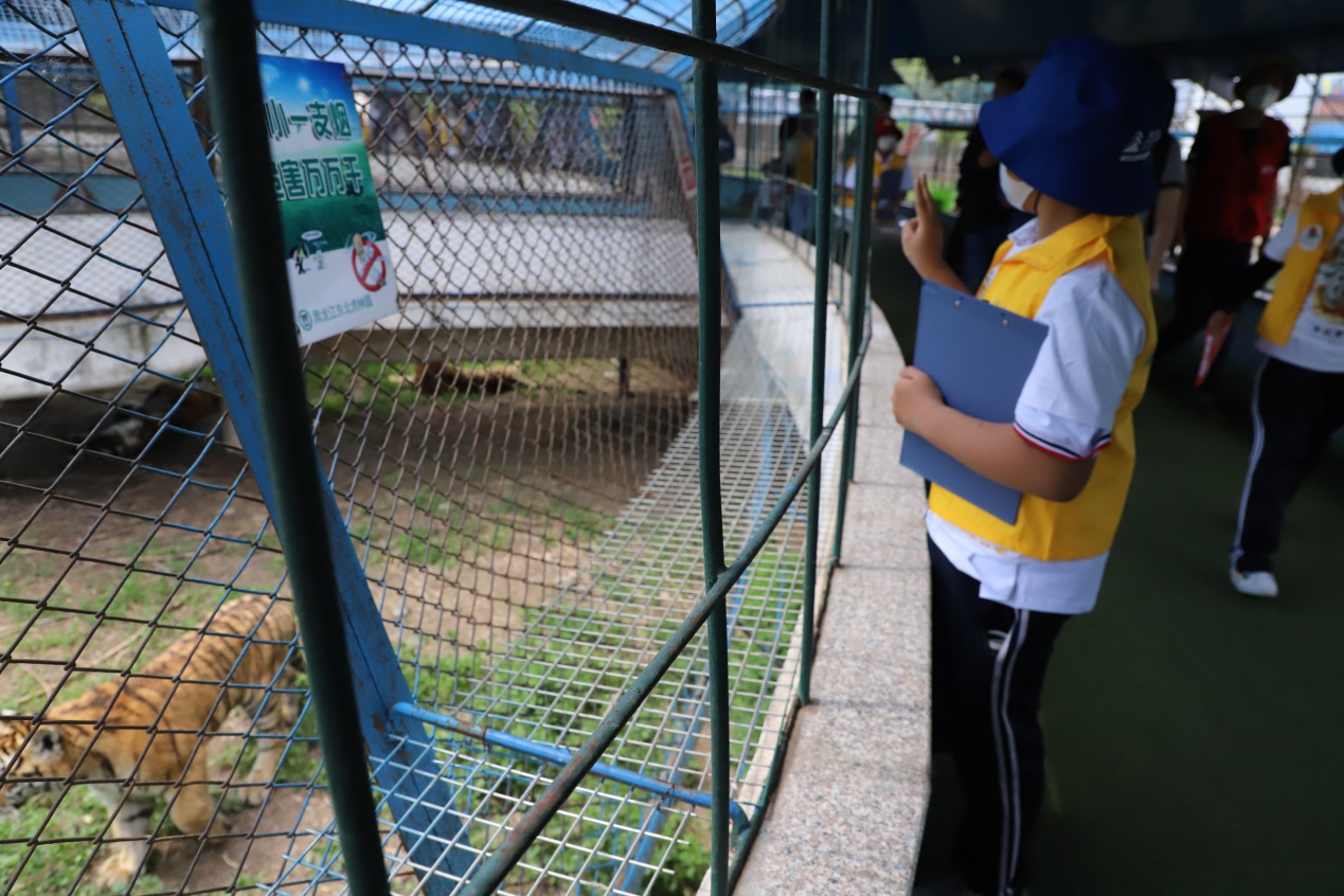 在東北虎林園工作人員的帶領下,小朋友們穿著統(tǒng)一的黃馬甲,手持研學游活動記錄單,充滿期待地走進東北虎林園,近距離觀察動物們的外貌特征、動作特點,細致聆聽工作人員的講解,認真記錄自己所看到的每一個細節(jié)、聽到的每一個知識,還有愛畫畫的小朋友畫下了自己親眼所見的老虎憨態(tài)可掬的樣子。