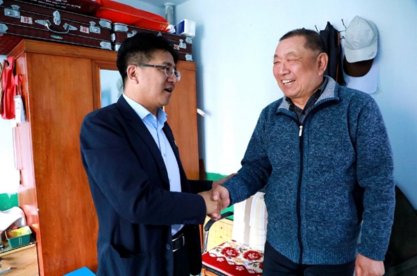 阿木爾林業(yè)局黨委委員、組織部部長王立昆(右)端午節(jié)慰問老黨員張俊峰(左)(王力 攝)