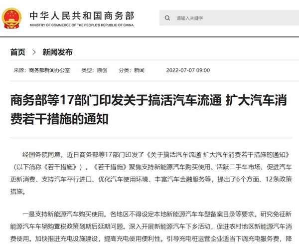 日前,商務(wù)部等17部門印發(fā)了《關(guān)于搞活汽車流通 擴(kuò)大汽車消費(fèi)若干措施的通知》,《措施》聚焦支持新能源汽車購買使用、活躍二手車市場、促進(jìn)汽車更新消費(fèi)、支持汽車平行進(jìn)口、優(yōu)化汽車使用環(huán)境、豐富汽車金融服務(wù)等,提出了6個方面、12條政策措施。