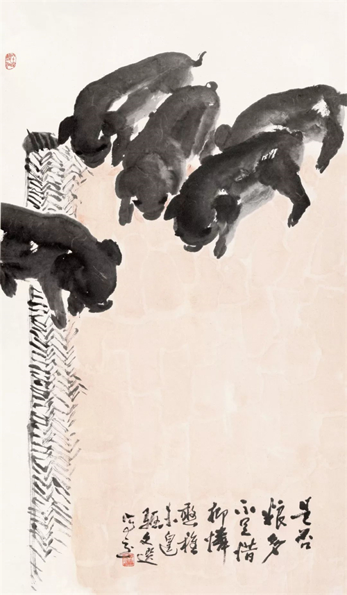 湯文選的人物、山水、花鳥、墨虎等一系列作品,融會著、貫穿著“三種傳統(tǒng)”?;螂[或顯,或化解之,或凝聚之,或熔裁之,或獨造之。“三種傳統(tǒng)”,可概括為現(xiàn)實主義在中國畫發(fā)展歷程中的三段式,亦曰交叉出現(xiàn)的不同歷史內(nèi)涵、文化反映的三種藝術(shù)狀態(tài):首先,是古代現(xiàn)實主義傳統(tǒng)——“外師造化,中得心源”。其二,是“五四”現(xiàn)實主義傳統(tǒng)——融合西法,崇尚寫實。其三,是新中國成立后倡導(dǎo)的革命現(xiàn)實主義傳統(tǒng)。深入火熱斗爭,深入工農(nóng)兵。學習延安木刻,學習民間年畫,學習蘇聯(lián)油畫現(xiàn)實主義的創(chuàng)作方法(50年代)。其后,“一手伸向生活,一手伸向傳統(tǒng)”(60年代)。在以上“三種傳統(tǒng)”的交匯點上,伸延出湯文選早期和中期的現(xiàn)實主義創(chuàng)作之路。湯文選中國畫藝術(shù)的現(xiàn)實主義,其主要特征為積極的入世態(tài)度,強烈的人文主義色彩,個性、民族性與時代性的完美統(tǒng)一,以及嚴肅的歷史使命感。
