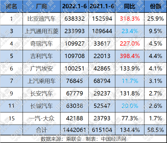 在乘聯(lián)會發(fā)布的6月新能源乘用車批發(fā)銷量廠商排名(TOP15)中,傳統(tǒng)品牌占據(jù)10席,共計銷售33.2萬輛,同比增長158.7%,市場份額接近六成,達到58.3%,1-6月,傳統(tǒng)品牌新能源累計銷售144.2萬輛,同比增長134.4%,份額同樣接近六成,為58.5%。