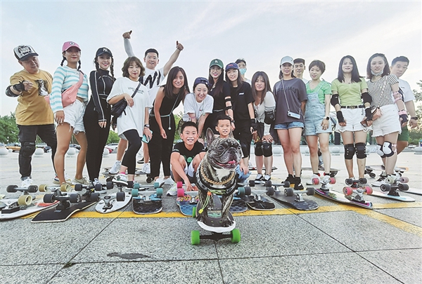 7月21日18時(shí)許,太陽島地鐵站出口附近的小廣場(chǎng),一群人抱著陸沖板陸續(xù)趕到,其中“80后”“90后”居多,還有帶孩子來的“寶媽”。不少人來的時(shí)候穿著上班的職業(yè)裝,換上圓領(lǐng)T恤,戴上鴨舌帽,配齊護(hù)具,簡(jiǎn)單熱身后,迫不及待地開滑。