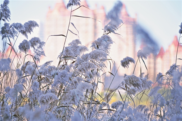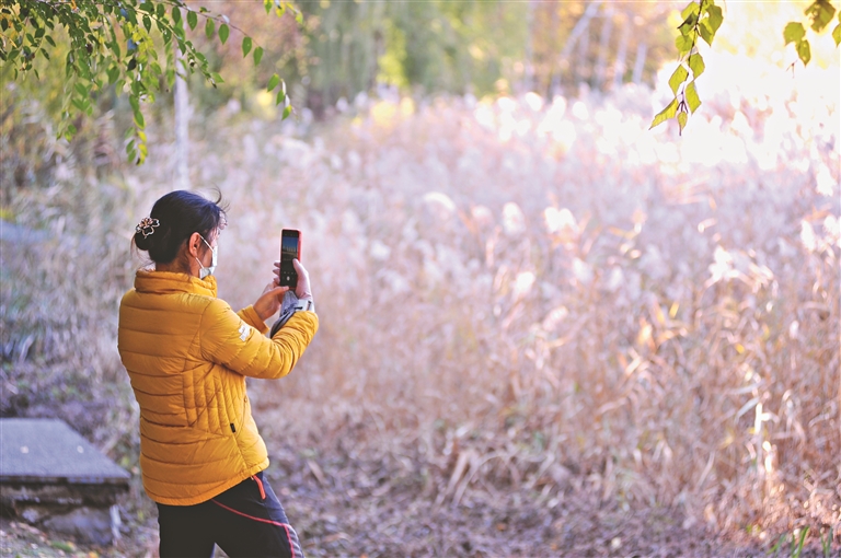 11日,哈爾濱市群力城市濕地公園內,大片的蘆花隨風搖曳,從高處望去,黃綠的蘆葦上好像蓋了一層厚厚的白雪,美麗又壯觀,吸引許多市民前來觀看、拍照。