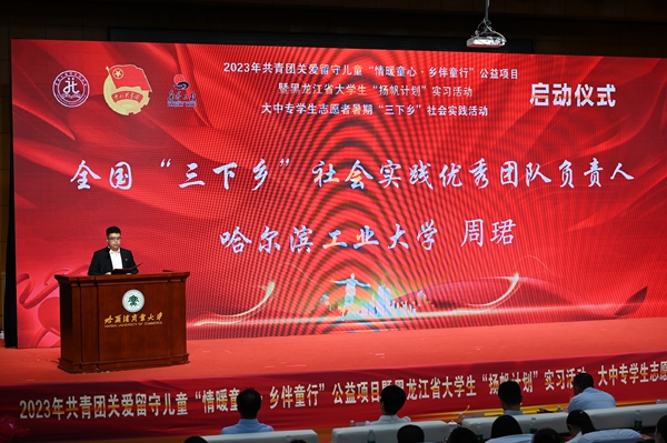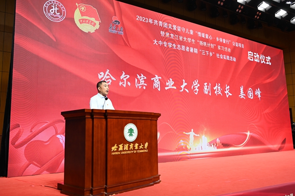 本次活動,在哈爾濱商業(yè)大學的大力支持下順利開展,哈爾濱商業(yè)大學副校長姜國鋒在儀式上致辭,他說:“學校建校71年來,立足立德樹人根本任務,聚焦‘為黨育人,為國育才’的職責使命,在不斷加強‘第一課堂’建設(shè)的同時,還依托學?!惑w兩翼’文化育人模式,充分發(fā)揮實踐育人的作用,通過開展‘三下鄉(xiāng)’‘返家鄉(xiāng)’等社會實踐和‘西部計劃’‘興邊富民’志愿服務項目,引導廣大青年學生堅持用習近平新時代中國特色社會主義思想凝心鑄魂,在社會的課堂中‘受教育、長才干、作貢獻’?!被顒蝇F(xiàn)場,播放《黑龍江省希望工程30年與光同行》和黑龍江省大中專學生志愿者暑期“三下鄉(xiāng)”社會實踐活動宣傳片,與會領(lǐng)導上臺共同啟動了“情暖童心·鄉(xiāng)伴童行”公益項目、大學生“揚帆計劃”實習活動、大中專學生志愿者暑期“三下鄉(xiāng)”社會實踐活動。
