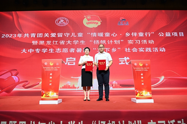黑龍江經(jīng)濟網(wǎng)訊(王丹陽 記者祝東)7月5日,2023年共青團關(guān)愛留守兒童“情暖童心·鄉(xiāng)伴童行”公益項目暨黑龍江省大學生“揚帆計劃”實習活動、大中專學生志愿者暑期“三下鄉(xiāng)”社會實踐活動啟動儀式在哈爾濱商業(yè)大學隆重舉行。共青團黑龍江省委副書記代東力、陳海平,哈爾濱商業(yè)大學副校長姜國峰,省直機關(guān)團工委書記趙明瑞,黑龍江省人力資源和社會保障廳、省知識產(chǎn)權(quán)局、省人民檢察院、省青少年發(fā)展基金會、哈爾濱市南崗區(qū)民政局、哈爾濱海關(guān)、哈爾濱海事局相關(guān)領(lǐng)導,以及哈爾濱商業(yè)大學的志愿者和哈爾濱市樂業(yè)小學師生代表參加本次活動。