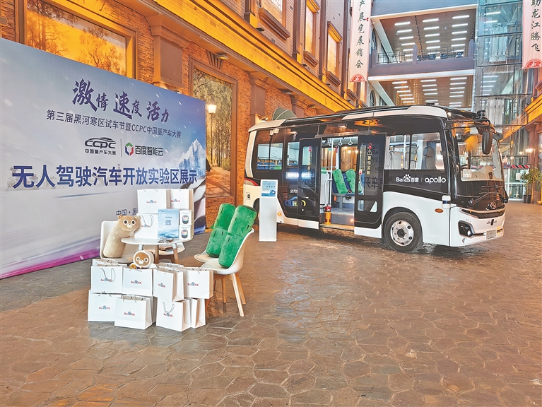 百度自動駕駛公交巴士亮相黑河寒區(qū)試車節(jié)。 圖片由受訪者提供