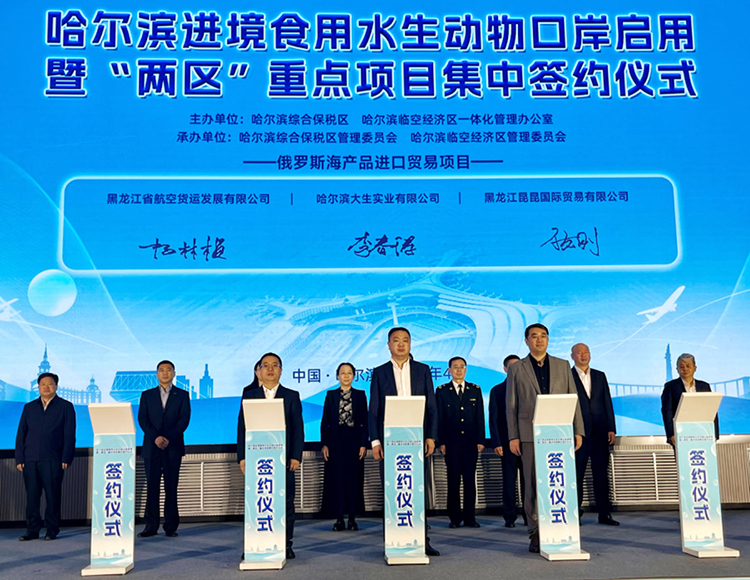 同日,哈爾濱進(jìn)境食用水生動(dòng)物口岸啟用暨“兩區(qū)”重點(diǎn)項(xiàng)目集中簽約儀式在哈爾濱臨空經(jīng)濟(jì)區(qū)舉行。“兩區(qū)”一體化辦公室主任介紹了哈爾濱進(jìn)境食用水生動(dòng)物指定監(jiān)管場(chǎng)地和保稅航油項(xiàng)目基本情況。