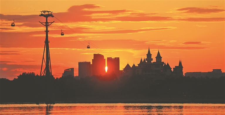近日,初夏的松花江碧水清清、綠意盈盈,一塊塊大大小小的濕地星羅棋布,宛如一顆顆珍珠散落在松花江兩岸。傍晚,落日熔金,夕陽(yáng)余暉映云成霞,游船悠悠,鷗鳥翩翩,江景如畫。