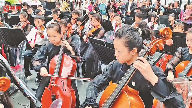 哈爾濱音樂(lè)學(xué)院少年交響樂(lè)團(tuán)演繹了多首經(jīng)典曲目。弦樂(lè)團(tuán)合奏《水門(mén)橋》和《春天在哪里》旋律優(yōu)美,帶領(lǐng)圍觀群眾穿越四季,感受大自然的美好;管樂(lè)打擊樂(lè)團(tuán)合奏的《龍的傳人》《波基上校》《紅犬》和《熱火打擊樂(lè)》激昂熱烈,展現(xiàn)了少年們的活力與激情。
