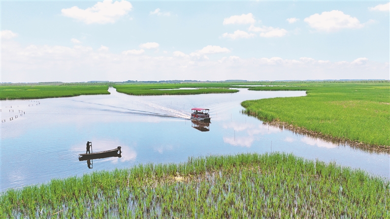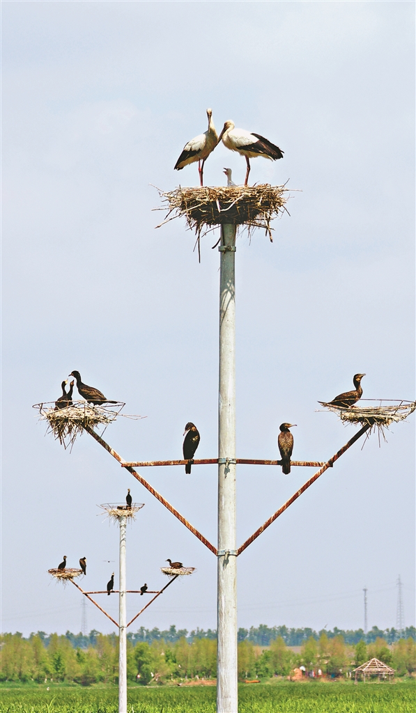 作為松花江流域保存完整、濕地多樣性特征顯著的天然遺跡,千鶴島濕地水草茂盛,魚類繁多,成為鳥類繁衍生息的天然場所。據(jù)風(fēng)景區(qū)工作人員介紹,由于濕地內(nèi)植被資源保護(hù)完好,每年都吸引大量候鳥來此繁衍生活,且數(shù)量逐年增加。特別是今年搭建38個人工鳥巢后,濕地內(nèi)的東方白鸛數(shù)量達(dá)到300余只,成為國內(nèi)數(shù)量最多的棲息種群。