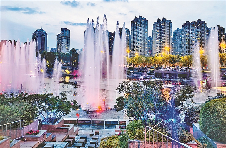 夏日夜晚,哈爾濱市群力金河公園音樂谷內(nèi),伴隨著悠揚(yáng)的樂曲,大型噴泉“翩翩起舞”,與霓虹彩燈交相輝映,構(gòu)成一幅美麗的畫面。