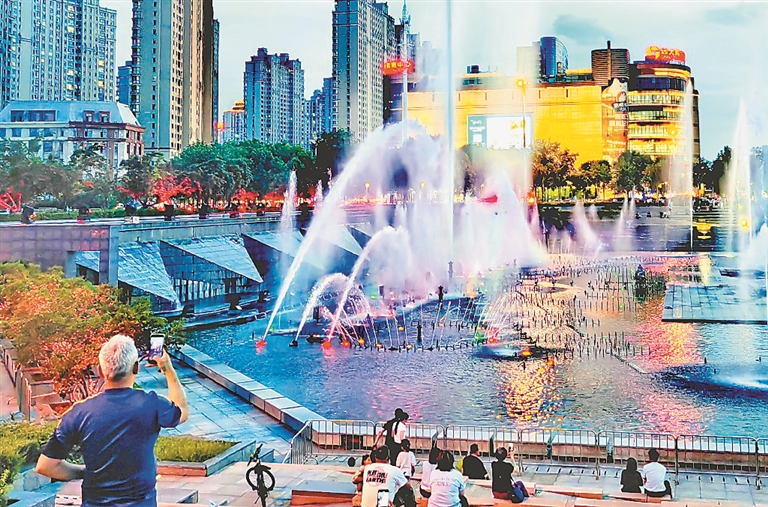 一邊觀賞著美麗的噴泉景觀,一邊享受著夏日清涼,市民、游客紛紛圍坐在四周,用手機(jī)記錄下精彩瞬間。
