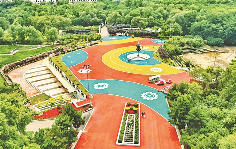 公園內(nèi)4000多平方米的休閑廣場,經(jīng)過改造、彩化,呈現(xiàn)出全新的面貌,孩子們在上面騎車、奔跑。彩色廣場將工業(yè)主題元素融入設(shè)計理念,與周圍的景觀小品相得益彰。