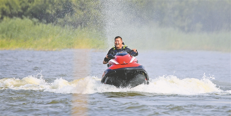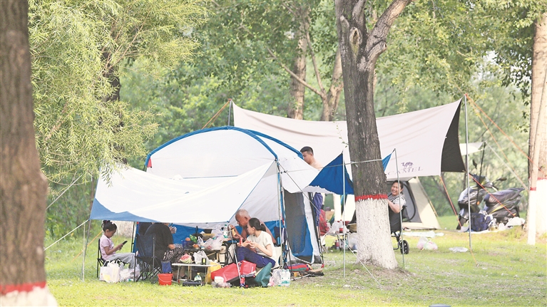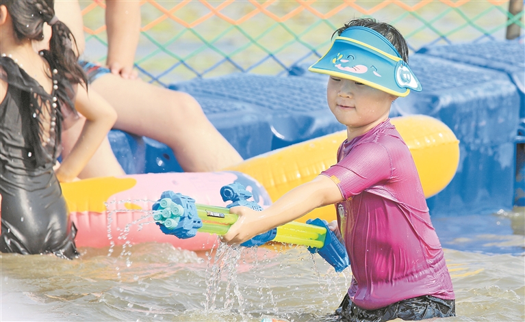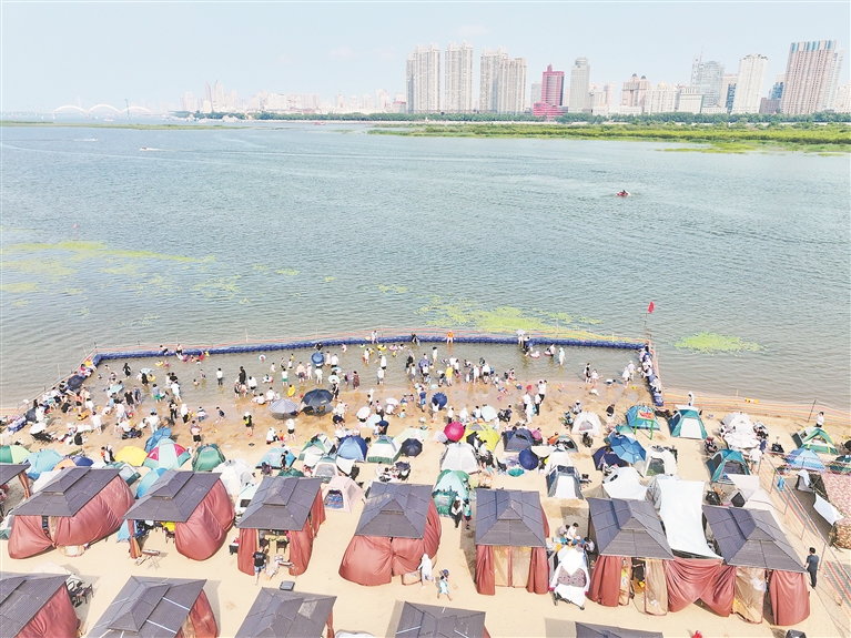 各個(gè)景區(qū)內(nèi),游客們撐起太陽(yáng)傘,戴上遮陽(yáng)帽,以抵御紫外線的照射。松花江畔的幾處浴場(chǎng),人頭攢動(dòng),家長(zhǎng)帶著孩子在這里戲水納涼。江邊的綠蔭里,滿是露營(yíng)的帳篷,市民吃著冰西瓜、喝著涼啤酒,愜意地避暑。本報(bào)記者 張澍攝
