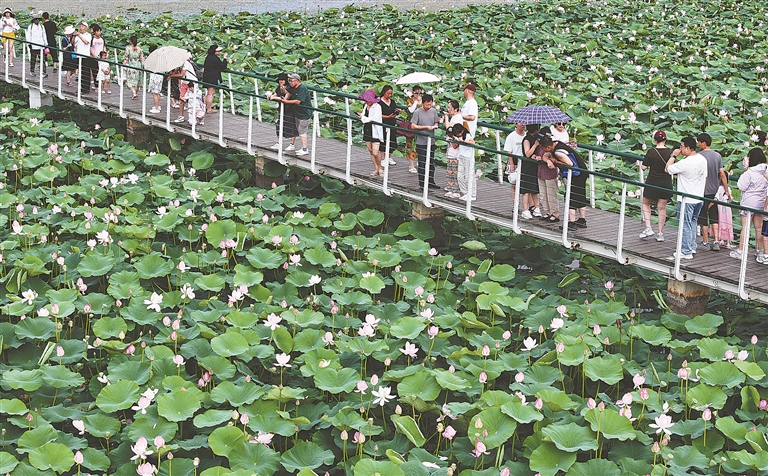 近日,哈爾濱文化中心濕地公園內(nèi)荷花綻放,吐露出它們的花苞,風(fēng)過(guò)荷塘帶來(lái)陣陣荷香,荷葉上的露水滴落,發(fā)出清脆的聲音,整個(gè)荷花池塘展現(xiàn)出夏天獨(dú)有的生機(jī)。這滿塘的荷花爭(zhēng)奇斗艷,吸引眾多游客、市民前來(lái)賞花打卡。數(shù)條觀光棧道延伸至濕地深處,人們走在棧道上,近距離觀看野鴨子、白骨頂雞等野生鳥(niǎo)類(lèi),與蘆葦、荷花等水生植物親密接觸。