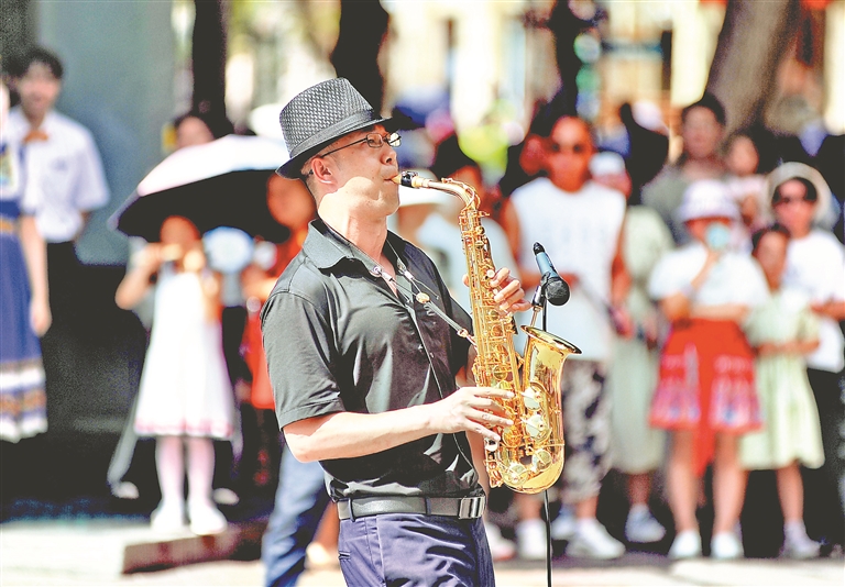 日前,哈爾濱市道里區(qū)中央大街與紅專街交口處,多位藝術(shù)家現(xiàn)場(chǎng)為人們表演,吸引許多游客圍觀。琵琶、薩克斯、手風(fēng)琴等樂(lè)器演奏的經(jīng)典樂(lè)曲,博得人們陣陣掌聲。美妙的旋律回蕩在街道上空,為百年老街增添了更多的藝術(shù)魅力。