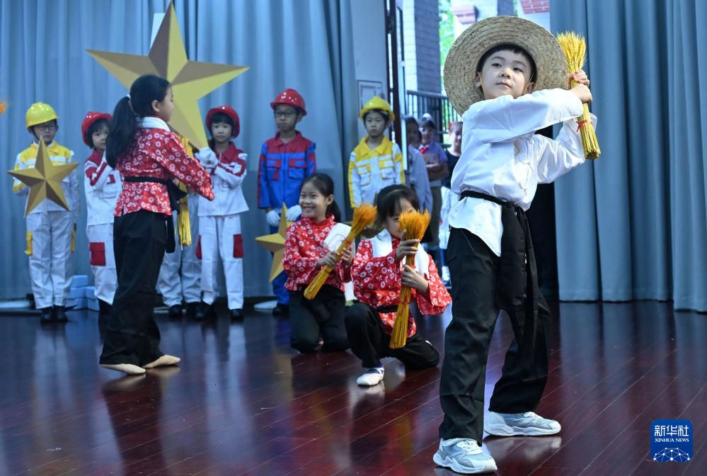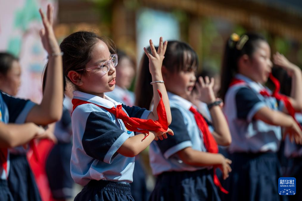 9月30日,湖北省黃石市沈家營小學(xué)的小朋友們在迎國慶活動上表演節(jié)目。新華社記者 伍志尊 攝