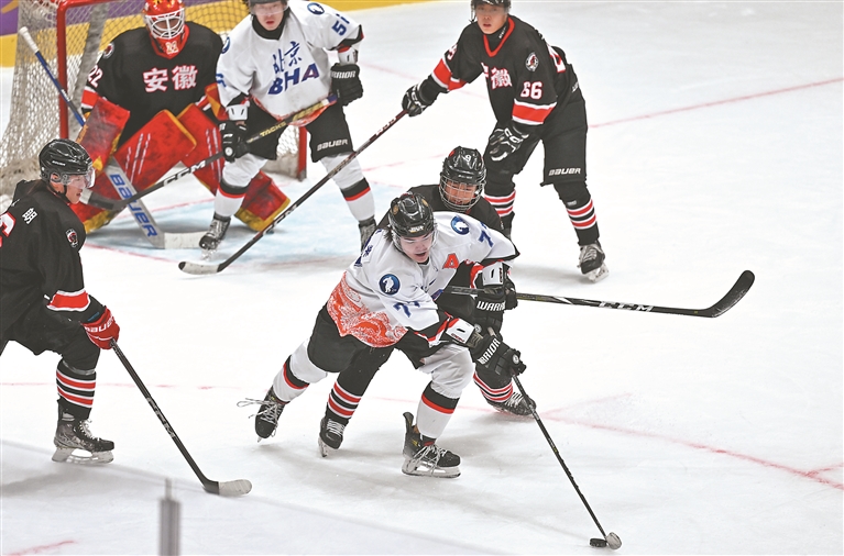 激烈的冰球比賽。本報(bào)記者 郭俊峰攝