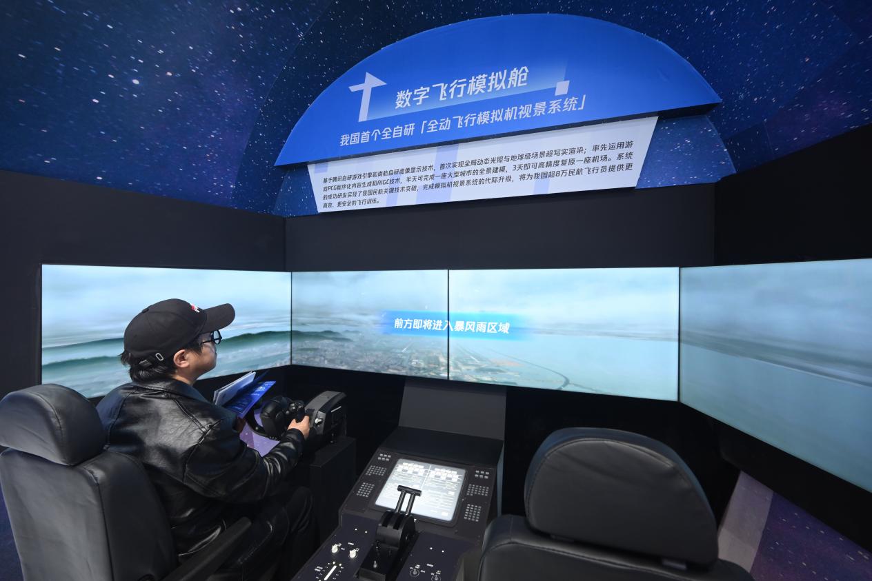 “只需要推動操縱桿,就能操作系統(tǒng),體驗(yàn)民航飛行員第一視角下、擬真的訓(xùn)練場景……”在展區(qū)前方,由南航自研虛像顯示技術(shù)和騰訊自研游戲引擎技術(shù)共同打造的全動飛行模擬機(jī)視景系統(tǒng),吸引眾多參觀者體驗(yàn)?;隍v訊自研游戲引擎,系統(tǒng)首次實(shí)現(xiàn)全局動態(tài)光照與地球級場景超寫實(shí)渲染,多邊形生成面數(shù)較之前提升380倍、貼圖精細(xì)度提升100倍,助力實(shí)現(xiàn)我國民航關(guān)鍵技術(shù)突破。