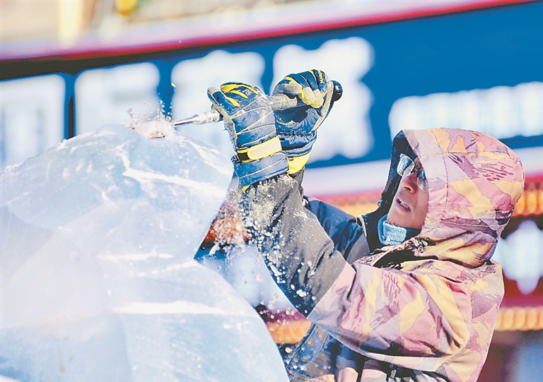 四五名工匠在現(xiàn)場忙碌,有的在切割冰塊,有的在精心雕琢,有的在清掃濺落的冰屑。
