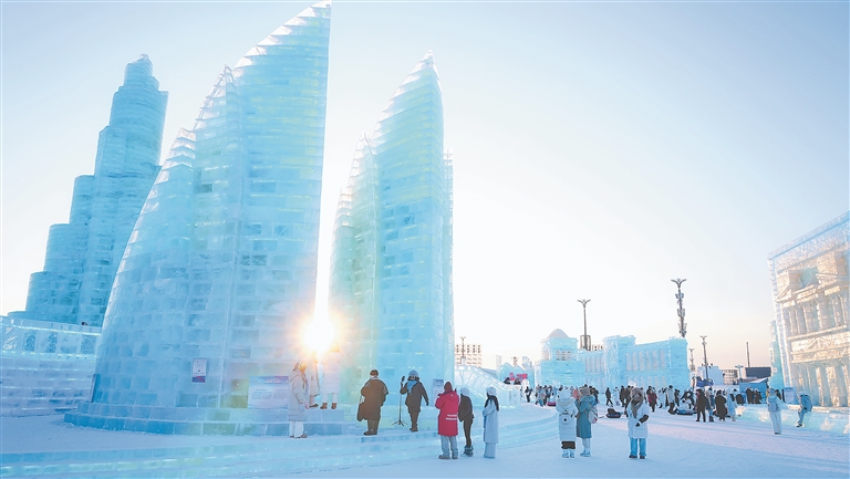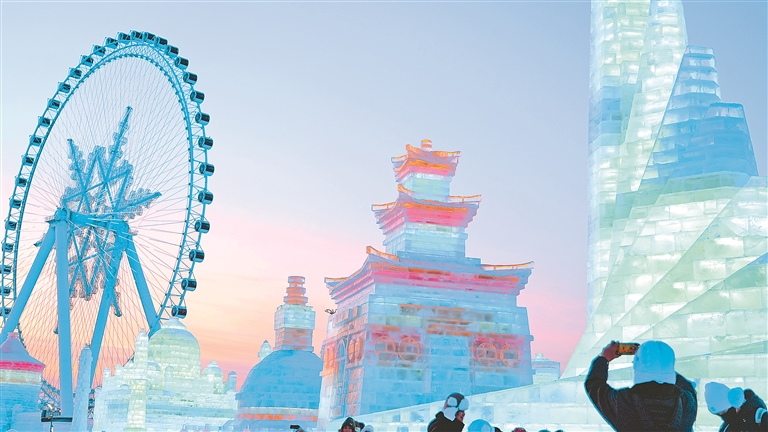 哈爾濱冰雪大世界將亞奧理事會成員的地標景觀以冰雪形式呈現(xiàn),獨具匠心的冰雕建筑讓游客足不出園游亞洲。本報記者 劉心楊攝