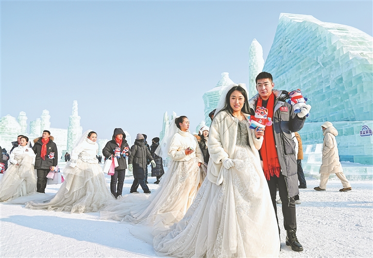 婚典儀式結(jié)束后,新人們乘坐哈爾濱冰雪大世界雪花摩天輪,俯瞰壯美的北國風(fēng)光,和游人一起賞冰玩雪、拍照留念。在太陽島雪博會,新人們欣賞雪雕藝術(shù)之美,在憨態(tài)可掬的《雪人先生》、氣勢磅礴的主塑《雪艷春》等雪雕前拍照留念,體驗“走著走著就一起白頭”的人工降雪浪漫場景,在潔白冰雪筑起的美輪美奐童話世界中,感受哈爾濱冰雪文化的浪漫氛圍。