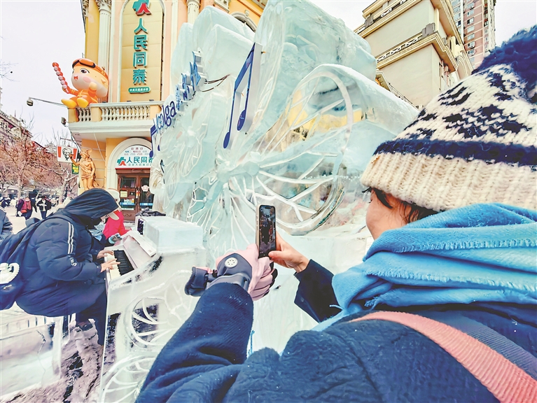 1月9日,哈爾濱市道里區(qū)中央大街和西九道街交口,一名游客在彈奏冰鋼琴。樂曲悠揚(yáng),飄蕩在百年老街的上空,人們紛紛上前圍觀拍照。